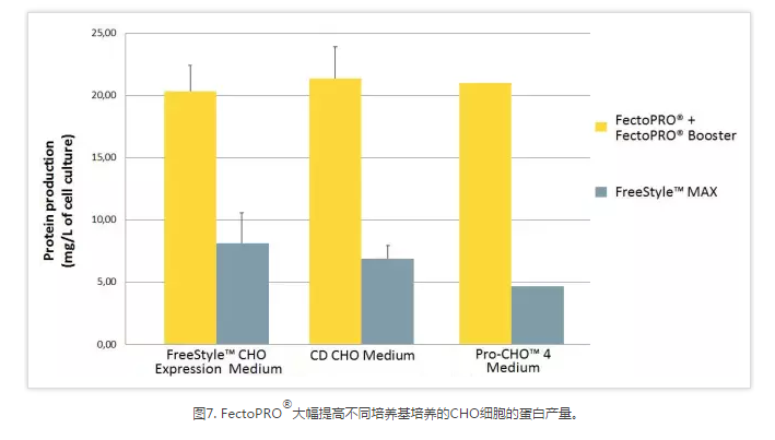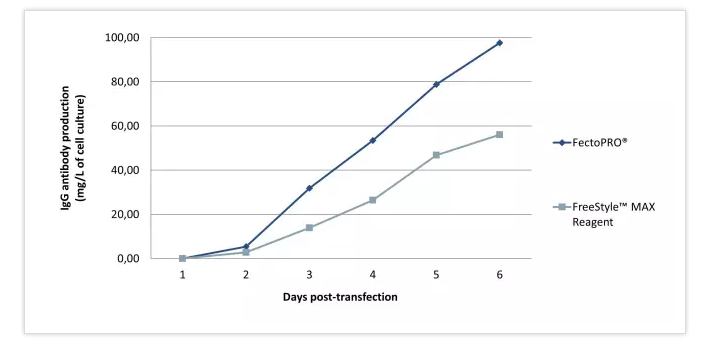 圖1. FectoPRO?大幅提高懸浮CHO細(xì)胞的抗體產(chǎn)量。按1×106個細(xì)胞/ml的密度將細(xì)胞培育在30ml的無血清培養(yǎng)基中,并依照每種試劑說明書推薦用量FectoPRO?(0.8 μg DNA/ml)或FreeStyle?MAX試劑(1.25 μg DNA/ml)進(jìn)行轉(zhuǎn)染。用蛋白質(zhì)G生物感應(yīng)器(fortéBIO? octet RED96 system)對重組小鼠IgG的產(chǎn)量監(jiān)測1~6天?!狿roteoGenix SAS(法國)提供的數(shù)據(jù)。