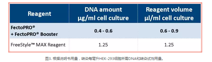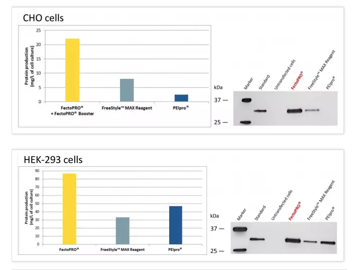 圖2. FectoPRO?大幅提高懸浮CHO和HEK-293細(xì)胞的蛋白產(chǎn)量。按1×106個細(xì)胞/ml的密度將FreeStyle? CHO-S和HEK-293F細(xì)胞培育在30 ml的無血清培養(yǎng)基中,并依照每種試劑說明書推薦用量FectoPRO?+FectoPRO?輔助藥劑Booster (0.4 μg DNA/ml)、FreeStyle?MAX試劑(1.25 μg DNA/ml)或PEIpro?(1 μg DNA/ml)進(jìn)行轉(zhuǎn)染。用蛋白質(zhì)G親和性定量法(HPLC)和Western Blot檢測轉(zhuǎn)染后72小時(CHO細(xì)胞)和120小時(HEK-293細(xì)胞)的IgG3-Fc (34 kDa)的產(chǎn)量。