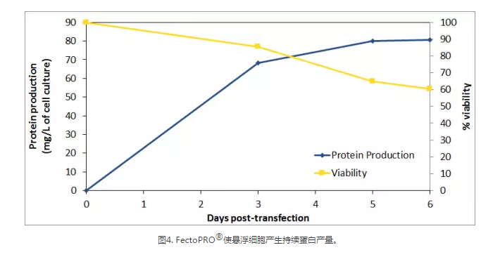 過去幾年,蛋白質(zhì)生產(chǎn)的持續(xù)時間有所增加,大部分蛋白質(zhì)生產(chǎn)過程持續(xù)1~2周,以獲得最佳的蛋白產(chǎn)量。FectoPRO?確保幾天內(nèi)產(chǎn)生持續(xù)的蛋白產(chǎn)量,同時保持較高的細(xì)胞活力以延長蛋白生產(chǎn)。
