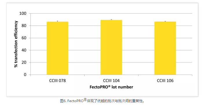 高質(zhì)量質(zhì)粒DNA的制備成本非常高,尤其是在進(jìn)行大規(guī)模蛋白質(zhì)生產(chǎn)時需要大量的DNA和許多質(zhì)粒。FectoPRO?通過使用0.4~0.6 μg/106/ml的細(xì)胞培養(yǎng)液將DNA成本縮減了40%~60%,使其成為生物制藥生產(chǎn)流程的一項經(jīng)濟(jì)實惠的選擇。