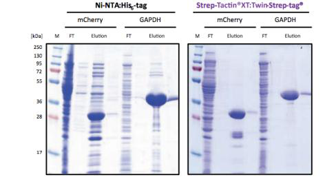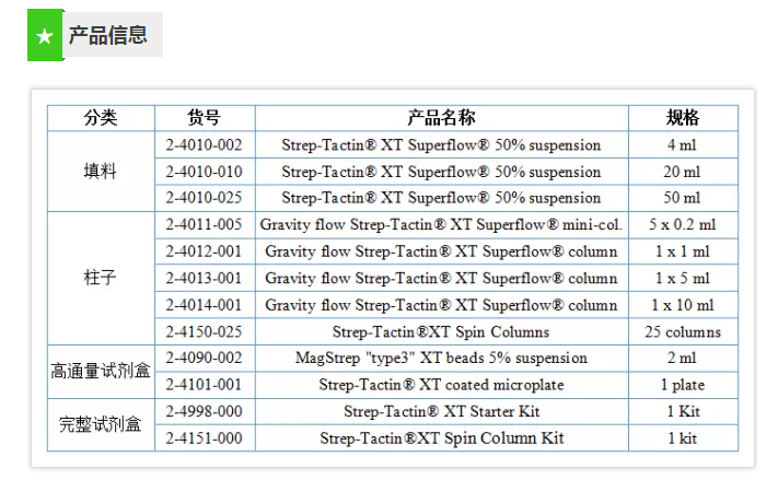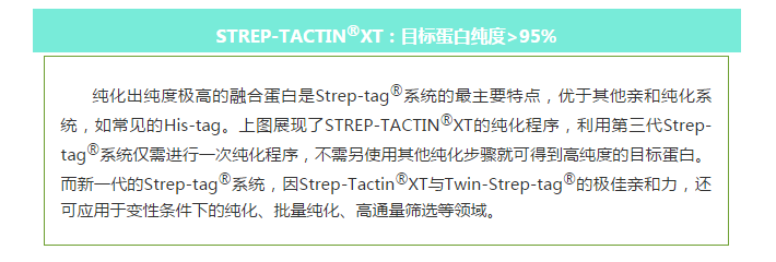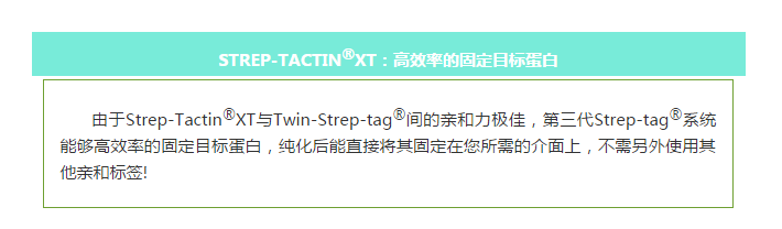 Strep-tag?是IBA life sciences基于生物素(Biotin)和鏈霉親和素(Streptavidin)之間的結合反應開發(fā)的蛋白純化系統(tǒng)。第三代Strep-tag?系統(tǒng):「Strep-Tactin?XT:Twin-Strep-tag?」蛋白純化系統(tǒng),其結合力可達pM級別但仍保持結合的可逆性和固定化蛋白的溫和復蘇能力。因此,用Strep-Tactin?XT 系統(tǒng)能有效提高您目標蛋白的純度,解決您實驗中所遇到的常見問題。
