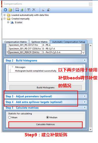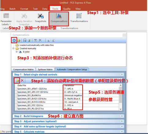 依次調(diào)整好各單管Control的Marker門(mén)的位置。此處不一一列舉?;氐窖a(bǔ)償界面。此處的3、4適用于使用補(bǔ)償beads調(diào)節(jié)補(bǔ)償?shù)那闆r(由于本次數(shù)據(jù)為細(xì)胞,此處不詳細(xì)列出,如對(duì)此步驟感興趣,可咨詢(xún)小達(dá)君)