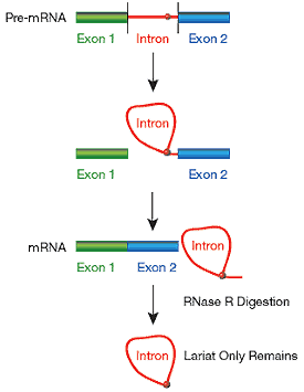 隨著環(huán)狀RNA的深入研究,環(huán)狀RNA制備問題就越來越備受關注。Lucigen提供大腸桿菌來源的RNase R,是一種Mg依賴性的3’ →5’核糖核酸外切酶,能消化基本上所有線性RNA,但不消化套索或環(huán)狀RNA的結構,或者3’突出短于7個核苷酸的雙鏈RNA。即是除了tRNA,5S RNA和內含子套索結構外,大多數(shù)細胞RNA都將被RNase R完全消化。如圖4,RNase R可從總RNA中分離出內含子前體mRNA剪切產生的套索RNA。以這種方法獲得的RNA作為模板來生產標記的cDNA,可作為含有潛在的內含子序列的微陣列的目標,或者用于包含完整的染色體或者基因組的重疊區(qū)域平鋪陣列。產生的cDNA不代表線性內含子,但其含有的序列是來源于內含子的。