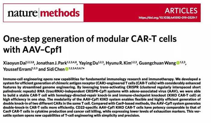 作者利用腺相關(guān)病毒( AAV )與CRISPR -Cpf1系統(tǒng),開發(fā)了一種高效的制備的Car-T的方法,而且具有顯著增強(qiáng)的特征。該技術(shù)使得Car-T制備的高效性大大提高。