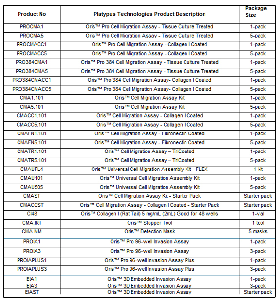 美國Platypus Technologies公司建立于2000年,是細胞分析領域產(chǎn)品的耗材供應商,熱賣產(chǎn)品為OrisTM和OrisTM Pro系列細胞遷移和侵襲實驗試劑盒。其開發(fā)的用于檢測細胞遷移和侵襲的細胞排斥區(qū)分析法,克服了Transwell和劃痕實驗的缺點。