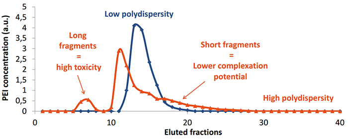 由于長片段的PEI對細(xì)胞有毒性,而短片段PEI結(jié)合DNA能力較差(見紅色),所以優(yōu)化PEI的片段大小,降低其分散性能減少細(xì)胞毒性,同時增加結(jié)合DNA的能力(見藍(lán)色)和轉(zhuǎn)染重復(fù)性。