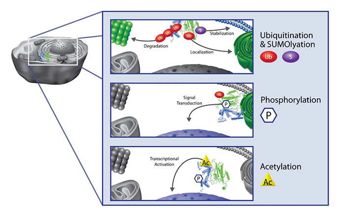 盡管目前已知的PTM的種類超過400種,但只有少數(shù)幾個(gè)被詳細(xì)研究過,主要包括甲基化、磷酸化、乙?;?、泛素化和SUMO化,它們被證明是幾乎所有細(xì)胞的關(guān)鍵調(diào)節(jié)因素,包括信號(hào)轉(zhuǎn)導(dǎo)、表觀遺傳學(xué)、基因和蛋白質(zhì)表達(dá)、蛋白質(zhì)穩(wěn)定性和定位以及細(xì)胞免疫。