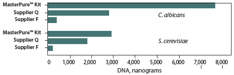 分別提取S.cerevisiae和C. albicans.中的DNA,用熒光染料33258對DNA進(jìn)行定量分析(RNA對該定量幾乎沒有影響)。圖中顯示的是兩次實(shí)驗(yàn)的平均DNA得率 。MasterPure Kit對C.albicans的提取量相比其它試劑盒高17倍;對S. cerevisiae的提取量相比其它試劑盒高12倍。