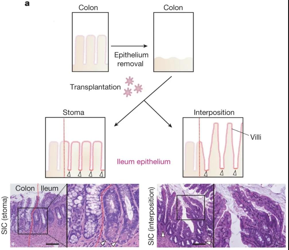 通過上皮置換產(chǎn)生SIC的策略。頂部,結腸上皮被去除(EDTA處理),然后回腸類器官被移植。在進行介入手術之前,移植的回腸上皮顯示出隱窩狀結構(左下圖和圖像)。移植后,會形成絨毛狀結構(右下圖和圖像)。白色箭頭表示潘氏細胞。
