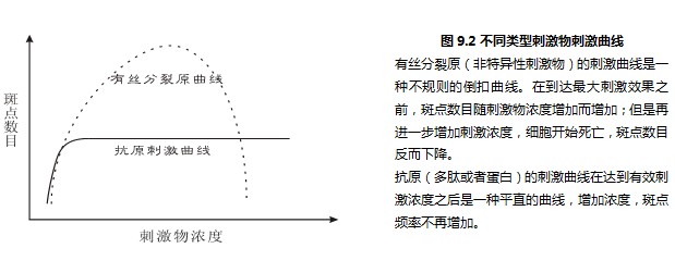 其一、非特異性的刺激物刺激效果不穩(wěn)定。如圖9.2所示,非特異性的刺激物(有絲分裂原Mitogen)的刺激曲線幾乎沒有平坦的部分。也就是說,刺激物的濃度有細(xì)微變化,馬上就會體現(xiàn)在刺激斑點(diǎn)數(shù)目的變化上了,這樣實(shí)驗(yàn)結(jié)果很難完全重現(xiàn)。相反,抗原的刺激曲線非常平坦,只要達(dá)到有效刺激濃度,斑點(diǎn)頻率就不再變化。
