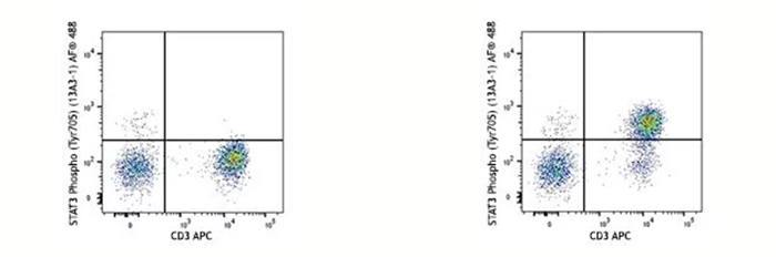 在蛋白翻譯后修飾(磷酸化、乙?;?、甲基化等)的研究過程中,固定劑不僅可以有效的“固定”住翻譯后修飾的位點(絲氨酸、蘇氨酸、酪氨酸等),也可以防止目標位點在活細胞中很快降解(比如磷酸酶會去除磷酸化修飾、去甲基化酶會移除甲基化修飾等)。下面的例子是用IL-6的重組蛋白刺激人外周血15分鐘后看STAT3第705位酪氨酸的磷酸化水平,在刺激完樣本后就需要通過固定來實現(xiàn)目的氨基酸磷酸化水平“停留”在IL-6刺激15分鐘這個節(jié)點上。