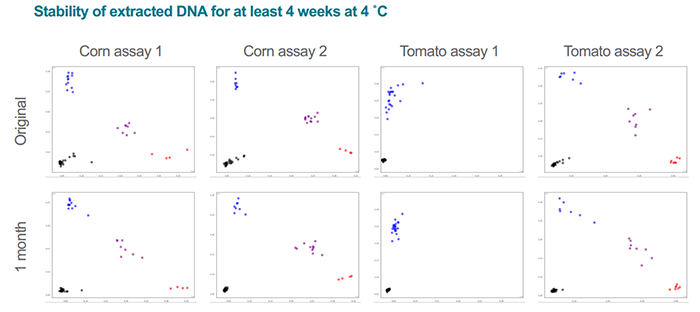 △圖2. 用QuickExtract從玉米和番茄中提取的DNA用KASP基因分型技術(shù)進(jìn)行聚類(Original),然后在4℃下儲(chǔ)存1個(gè)月,再將樣品進(jìn)行聚類(1month) ,實(shí)驗(yàn)結(jié)果完全一致。