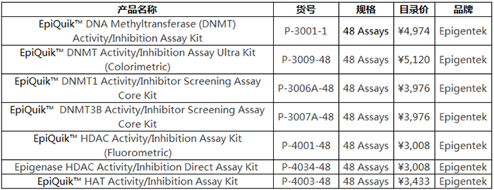 Epigentek還為您提供表觀遺傳相關(guān)的DNMT, HDAC和HAT核提取物檢測試劑盒。