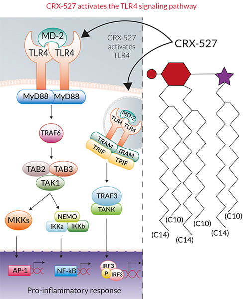 CRX-527屬于AGP(aminoakylglucoaminide 4-phosphate)家族,是一種合成的脂質A類似物,可以激活Toll樣受體4(TLR4),進而啟動MyD88和TRIF依賴的促炎信號級聯(lián)反應。重要的是,CRX-527無需TLR4輔助受體CD14即可激活TRIF介導的Ⅰ型干擾素信號通路。 CRX-527與其他AGPs一樣,毒性低于LPS,并且重要的是保留了它的免疫刺激特性。作為未來的疫苗佐劑和單獨的免疫刺激劑,AGPs具有巨大潛力。