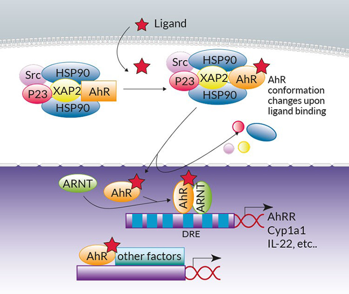 典型AhR訊號(hào)已經(jīng)被廣泛綜述過(guò)1。簡(jiǎn)而言之,在沒(méi)有配體的情況下,AhR位于細(xì)胞質(zhì)中Hsp90:XAP2:p23:Src伴侶蛋白復(fù)合物內(nèi),當(dāng)配體結(jié)合時(shí),復(fù)合物發(fā)生構(gòu)象變化并轉(zhuǎn)移到細(xì)胞核中。伴侶蛋白被釋放,AhR和AhR核轉(zhuǎn)位子(ARNT)異源二聚。在細(xì)胞核中,AhR:配體:ARNT三聚體與AhR靶基因上游調(diào)節(jié)區(qū)域的二噁英應(yīng)答元件(DRE)結(jié)合,以控制包括細(xì)胞色素P450依賴性單加氧酶Cyp1a1、AhR 抑制因子(AhRR)和IL-22白細(xì)胞介素的轉(zhuǎn)錄。值得注意的是,無(wú)輪是在基因組水平上通過(guò)與其他轉(zhuǎn)錄因子(例如NF-κB)相關(guān)聯(lián),還是在非基因組水平上(例如通過(guò)釋放Src激酶),非典型AhR信號(hào)通路也有被報(bào)道過(guò)2,3。