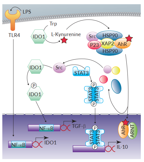 AhR參與調(diào)節(jié)促炎反應(yīng)和耐受反應(yīng)的機(jī)制可以從多方面解釋,除了前文提過(guò)可以導(dǎo)致IL-22產(chǎn)生的典型AhR信號(hào),AhR也通過(guò)非基因組途徑導(dǎo)致至少兩個(gè)抑制性效果。研究發(fā)現(xiàn)與AhR相關(guān)的Src激酶能夠磷酸化吲哚胺2,3-雙加氧酶(IDO1),進(jìn)而激活NF-κB轉(zhuǎn)錄因子誘導(dǎo)DCs中抑制性細(xì)胞因子TGF-β(transforminggrowth factor)的轉(zhuǎn)錄,達(dá)到抑制小鼠對(duì)LPS的過(guò)度應(yīng)答9。此外, IDO1對(duì)Trp的降解提供了例如L-型犬尿氨酸(L-Kynurenine)的AhR激動(dòng)劑,提示了這通路與Treg的產(chǎn)生有關(guān)9。在巨噬細(xì)胞中,AhR另一個(gè)抑制作用是在LPS誘導(dǎo)下,AhR協(xié)同Src激酶和STAT3信號(hào)通路產(chǎn)生抗炎細(xì)胞因子IL-10。值得留意的是,TLR4對(duì)LPS的識(shí)別可促進(jìn)巨噬細(xì)胞中AhR的表達(dá),但目前尚不清楚在其他模式識(shí)別受體配體刺激的情況下是否也是如此10。