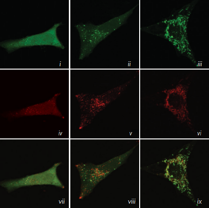 ☆HeLa-Difluo?hLC3細胞被25μM rapamycin 單獨處理或25μM rapamycin和 500nM bafilomycin A1(抑制自噬體和溶酶體融合)聯(lián)合處理。孵育24小時,用2% PFA固定細胞,并用共聚焦顯微鏡分析結(jié)果。請注意在圖片viii中,黃色(自噬體)和紅色(自噬溶酶體)斑點均顯著提升,而圖片ix中的斑點幾乎均為黃色(自噬體)。