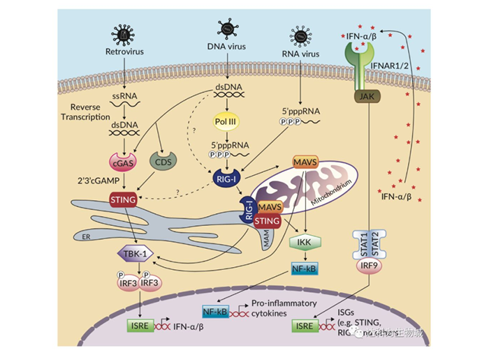 感受器cGAS和RIG-I通過單獨的接頭蛋白來識別不同的核酸和信號。cGAS感受細胞質(zhì)中異常DNA的存在和濃度,而后通過環(huán)二核苷酸2’3’-cGAMP[2]募集干擾素基因刺激因子(STING, or MITA/ERIS/MPYS)。RIG-I檢測出5`-二/三磷酸末端未加帽的病毒RNA和短平末端雙鏈部分的病毒RNA后,其與線粒體抗病毒信號蛋白(MAVS, or IPS-1/VISA/Cardif)[1]結(jié)合。它們激活后,cGAS/STING和RIG-I/MAVS將觸發(fā)共同的信號級聯(lián)反應(yīng)導致I型干擾素(IFNs)和促炎性因子的產(chǎn)生。