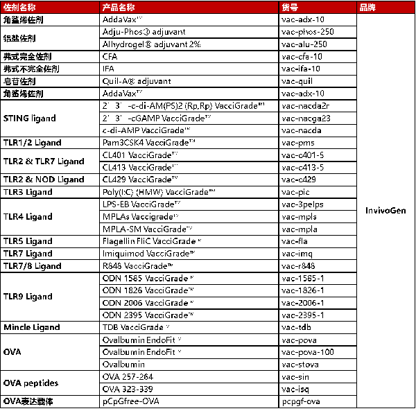 當前,針對COVID-19的疫苗研發(fā)以前所未有的速度在世界范圍內(nèi)陸續(xù)開展,世界各地的科學家正在探索開發(fā)針對SARS-CoV-2的有效疫苗的所有潛在策略。大多數(shù)用于COVID-19的候選疫苗旨在誘導針對病毒S蛋白的中和抗體,防止病毒通過人ACE2受體攝取從而阻止感染。COVID-19疫苗開發(fā)前景的顯著特征是正在評估的技術(shù)平臺的多樣性,包括:減毒活疫苗,基于病毒載體的疫苗,基于重組蛋白的疫苗,DNA疫苗和RNA疫苗。其中重組蛋白疫苗通常使用SARS-CoV-2蛋白(例如S蛋白)在宿主中引起免疫反應(yīng)。通常與佐劑結(jié)合使用以提高免疫原性。迄今為止,已進入臨床試驗的COVID-19候選疫苗包括Moderna開發(fā)的mRNA疫苗(NCT04283461)和康希諾 (NCT04341389)開發(fā)的重組腺病毒疫苗。此外,諸如AS03和MF59等佐劑正在重組蛋白疫苗中進行探索,使用佐劑可增強免疫原性并降低劑量,使更多人接種疫苗成為可能。天然免疫專家InvivoGen提供科研用途的佐劑和OVA產(chǎn)品供研究人員選擇。