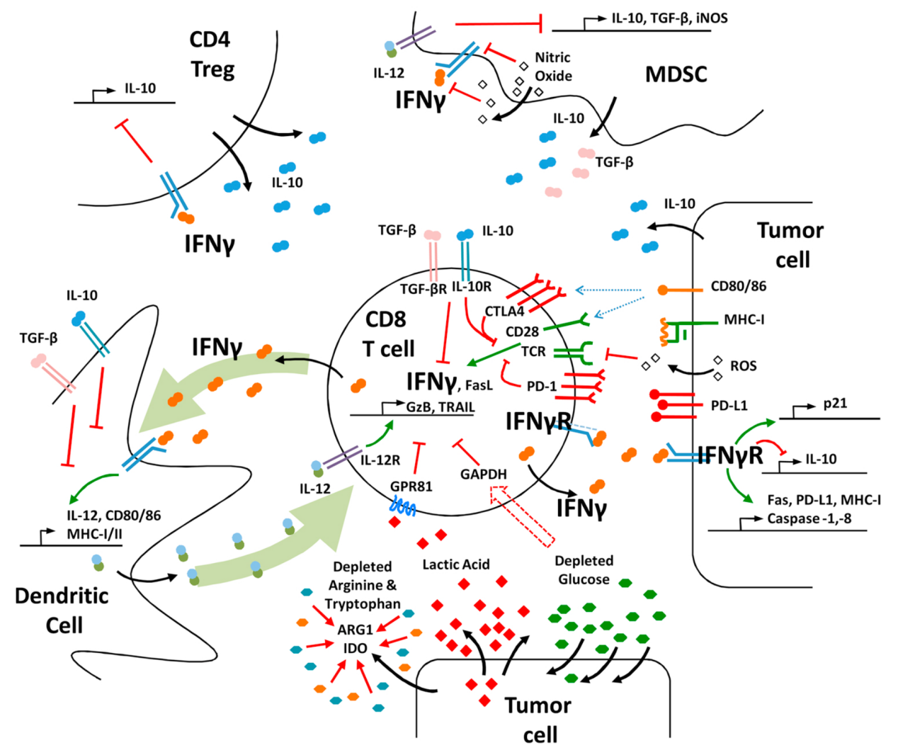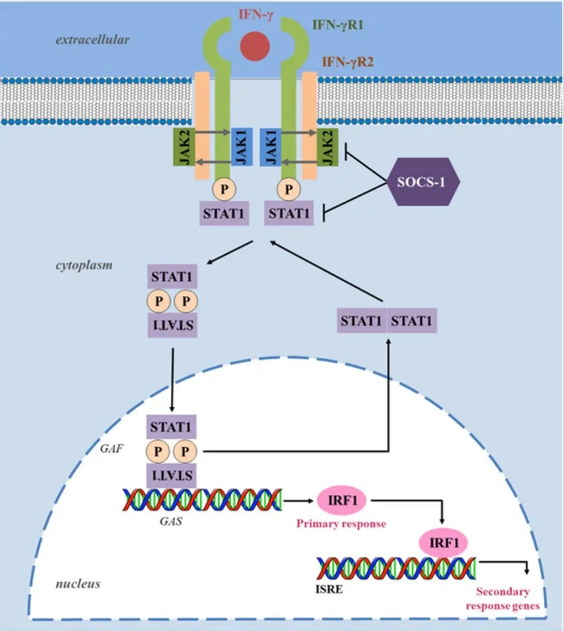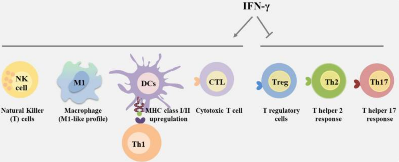 IFN-γ信號(hào)通路協(xié)調(diào)多種生物反應(yīng),在先天和適應(yīng)性免疫中扮演的重要角色。IFN-γ可以通過(guò)促進(jìn)Th1細(xì)胞、CD8+T淋巴細(xì)胞、NK細(xì)胞、樹(shù)突狀細(xì)胞及巨噬細(xì)胞的活性,抑制Treg、Th2和Th17細(xì)胞分化和功能,發(fā)揮免疫調(diào)節(jié)作用。此外,IFN-γ可激活巨噬細(xì)胞,使其分化為M1型巨噬細(xì)胞。